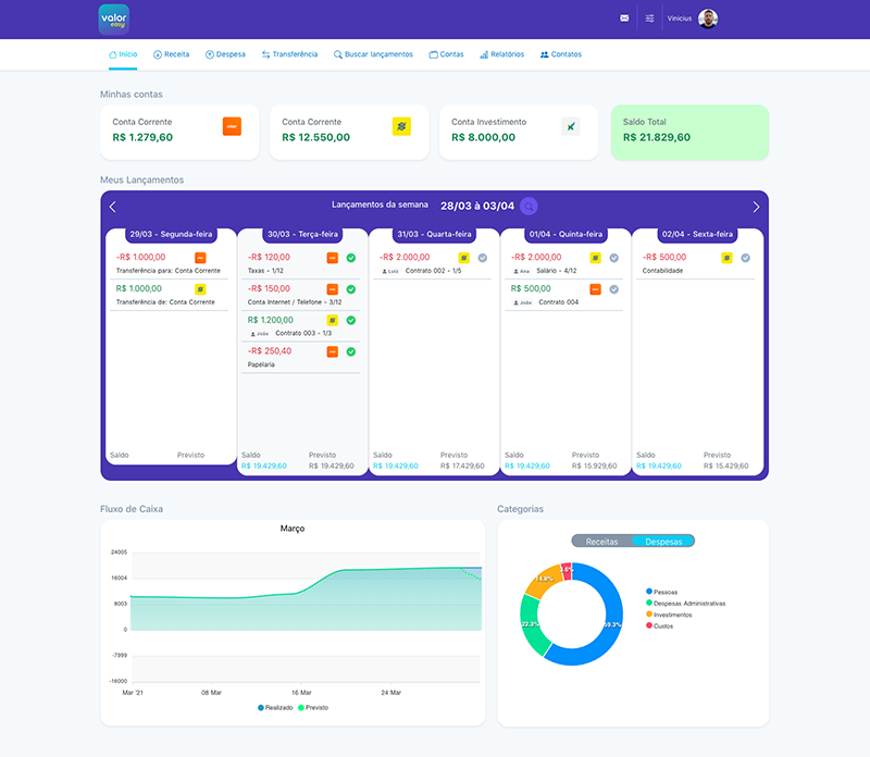 Controle suas contas a pagar e a receber de forma clara e intuitiva.